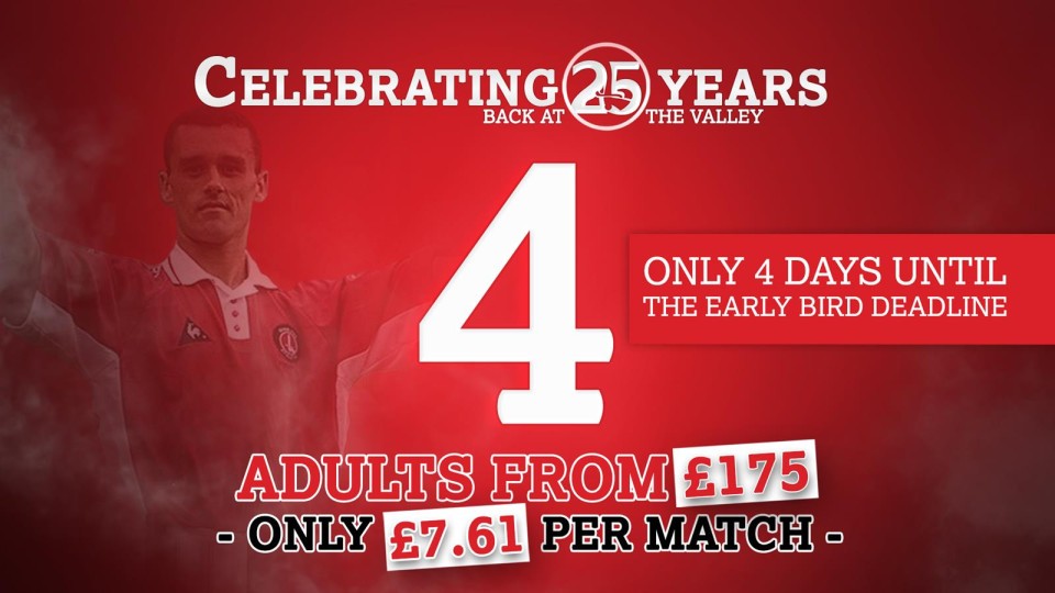 Just four days remain until the club’s early-bird season ticket deadline passes, meaning that time is running out for supporters to secure their place at The Valley for every home league match of 2017/18, as well as their free, six-month subscription to the club’s new, premium video service.