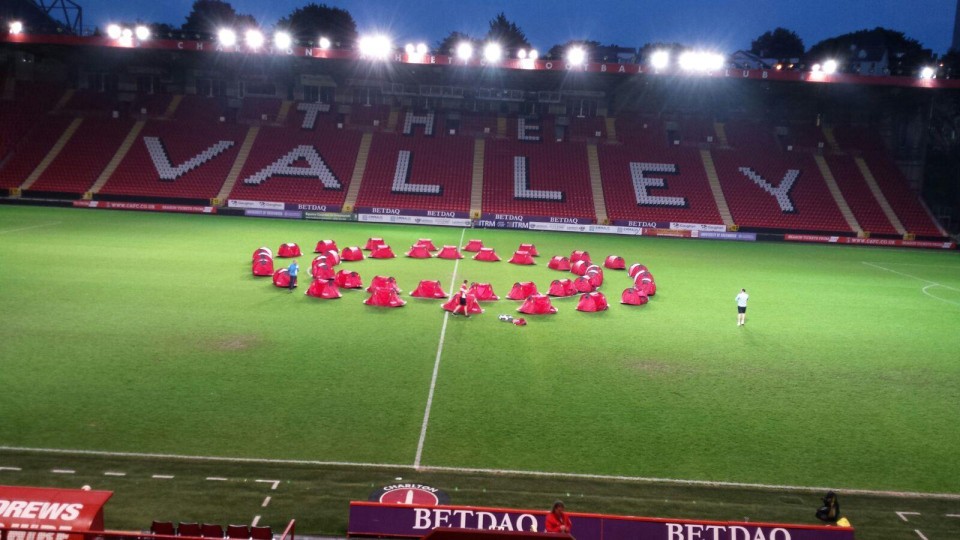 Young Charlton Athletic fans braved the stormy weather by pitching up tents and camping on the pitch on Sunday night.