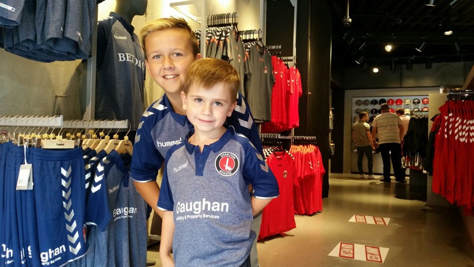 The new shop opened today at 12noon and cousins Cody, 11, and Tommy, 5, were two of the first fans to purchase a new Charlton Athletic away shirt.