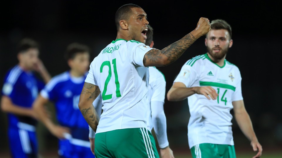 Josh Magennis netted twice in Northern Ireland’s win over San Marino on Friday in World Cup Qualifying Group C.