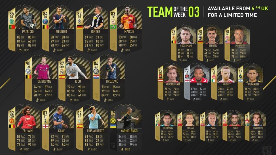 The likes of Harry Kane, Kevin De Bruyne, Marouane Fellaini – all stars of the Premier League – are in the Ultimate Team squad for this week, game week three, as is Isco from the current champions of Europe Real Madrid.