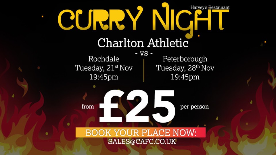 The Addicks’ late kick-offs against both Rochdale on Tuesday, November 21st and Peterborough United on Tuesday, November 28th will play host to our popular curry night in Harvey’s Restaurant.