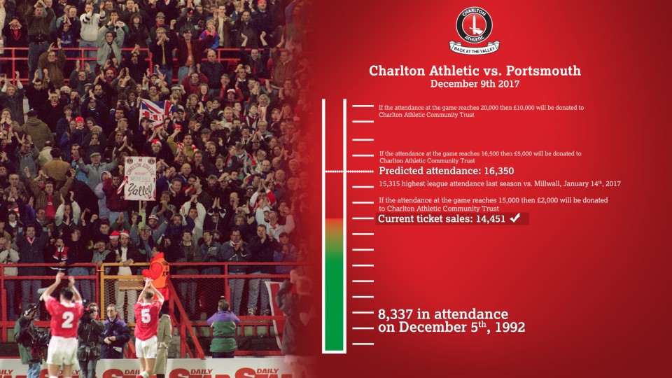 Charlton Athletic are hoping to guarantee a donation of at least £5,000 to the Charlton Athletic Community Trust with an attendance of more than 16,500 being targeted for Saturday’s anniversary game.