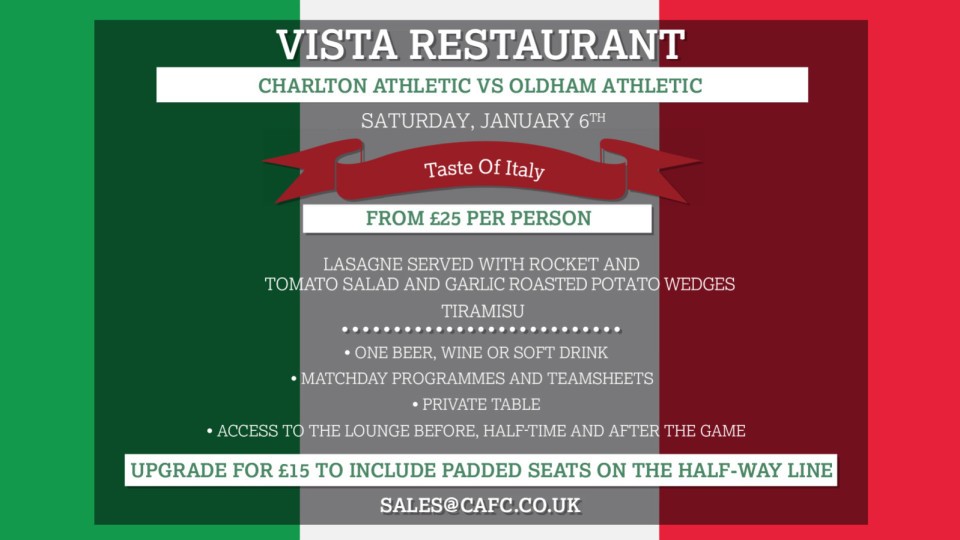 Charlton supporters can enjoy a two-course Italian set-menu and a drink, ahead of our home game against Oldham Athletic on Saturday, January 6th (3pm).