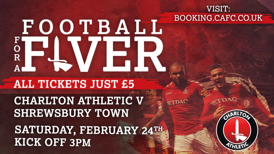 Charlton’s Football For A Fiver ticket promotion will be back at The Valley when the Addicks host fellow promotion chasers Shrewsbury Town on Saturday, February 24th (3pm) and tickets are now on sale.