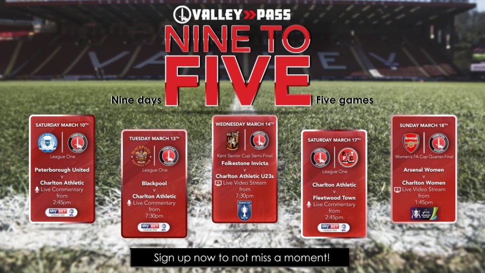 The club’s video and audio subscription service will be providing live commentary as normal for the upcoming Sky Bet League One games against Peterborough United, Blackpool and Fleetwood Town. In addition Valley Pass will also be have live video streams of our U23s Kent Senior Cup semi-final against Folkestone Invicta on Wednesday and next Sunday’s Women’s FA Cup quarter-final between Arsenal Women and Charlton Women.