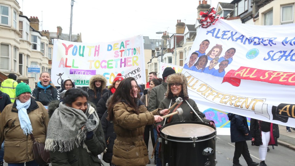 Around 200 were in attendance for the annual event to celebrate equality and inclusion, despite the cold weather. Young people from Cardwell Primary School, Alexander McLeod Primary, Cherry Orchard School and Charlton Toy Library all made banners under the parade theme: All Different; All Special; All Together.