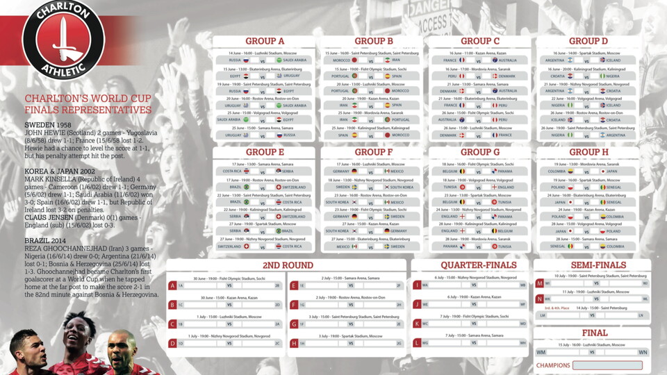 The big kick-off at this summer’s FIFA World Cup is just days away and supporters can keep up to date with every match of the tournament by downloading our bespoke, Charlton wall chart.