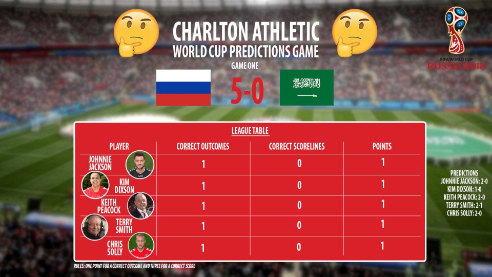 Johnnie Jackson, Chris Solly, Keith Peacock, Kim Dixson and Terry Smith will be going head to head throughout the tournament and, on Thursday, they all correctly guessed that hosts Russia would beat Saudi Arabia.