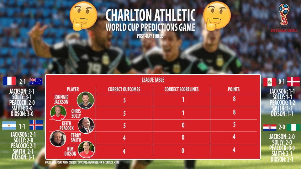 Johnnie Jackson and Chris Solly have taken an early lead in our Charlton FIFA World Cup predictions game, with the duo both having correctly guessed that Croatia would beat Nigeria 2-0 on Saturday night.