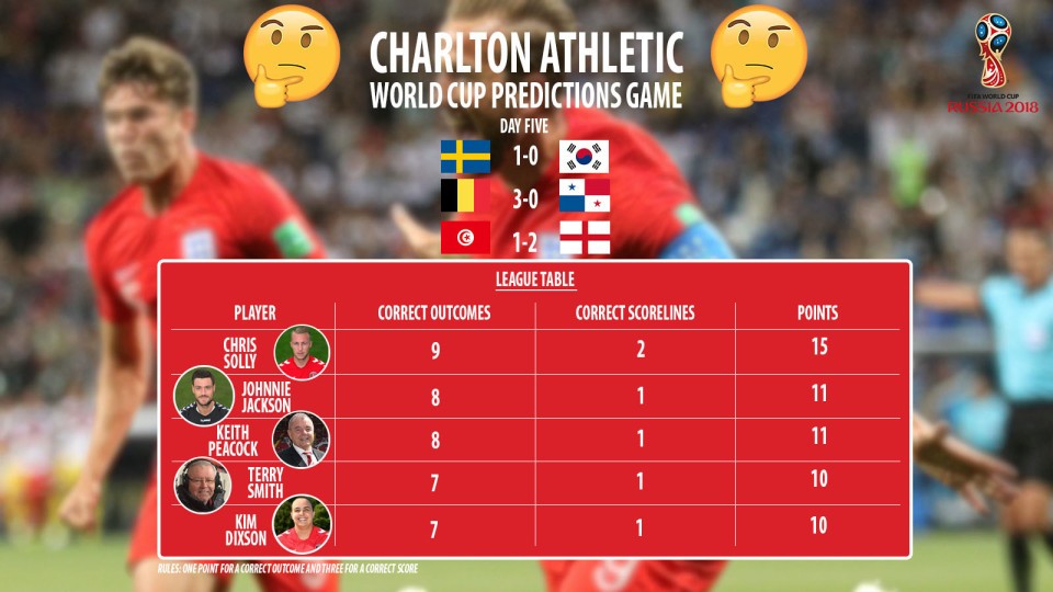 Charlton skipper Solly also correctly forecasted a 1-0 win for Sweden over South Korea, followed by an easy win for Belgium. The full-back racked up an impressive seven points, almost doubling his overall score to 15, keeping him at the top of the leaderboard.