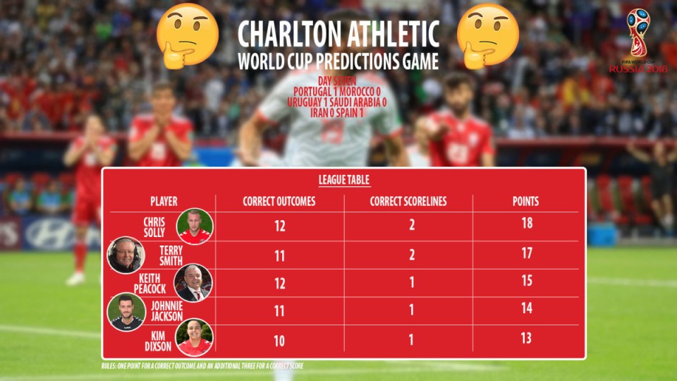 Addicks captain Chris Solly currently sits at the top of the leaderboard and, throughout the competition, he, Johnnie Jackson, Keith Peacock, Kim Dixson and Terry Smith will be predicting the scores of every world cup match.