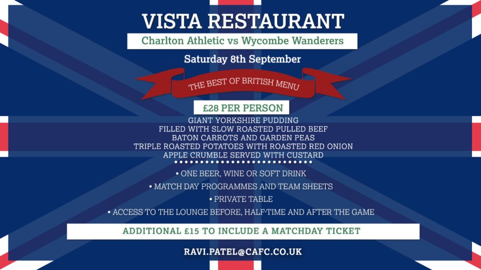 Supporters can relax and enjoy the atmosphere of The Valley’s ever-popular Vista Restaurant when Charlton take on Wycombe Wanderers on Saturday, September 8th with our ‘Best of British’ theme.