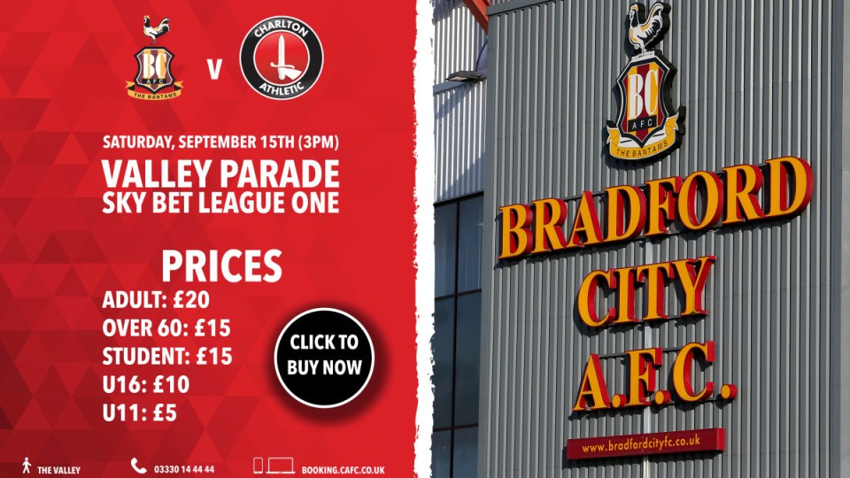 Tickets for Charlton’s Sky Bet League One clash against Bradford City on Saturday will be available to buy from the Northern Commercials Stadium.