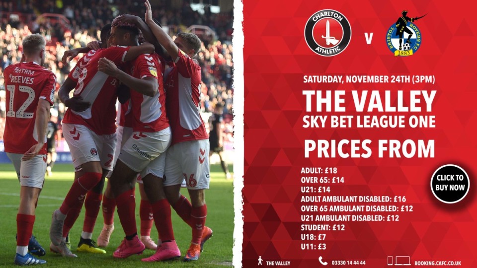 The Addicks host Bristol Rovers on Saturday, November 24th. For full pricing information, please see below.