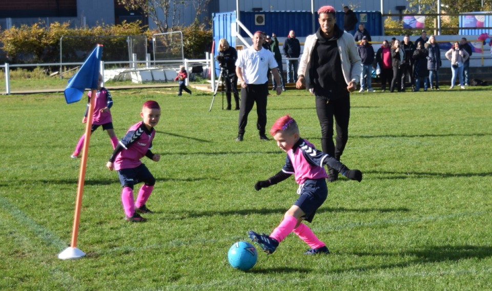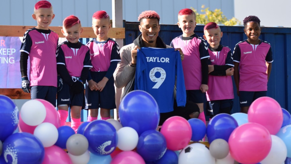 Lyle Taylor went to watch six-year-old Harry Goedhart and his teammates yesterday and gave the boys a brand new, pink hummel kit to thank them for their support of his Pink October campaign.