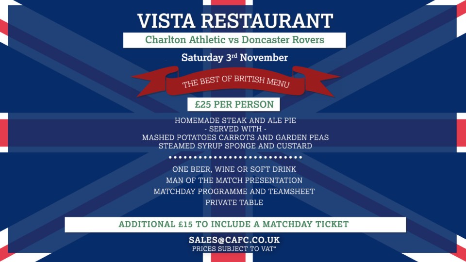 Supporters can enjoy a two-course, Best of British-themed set-menu ahead of Charlton’s home game against Doncaster on Saturday, November 3rd (3pm).