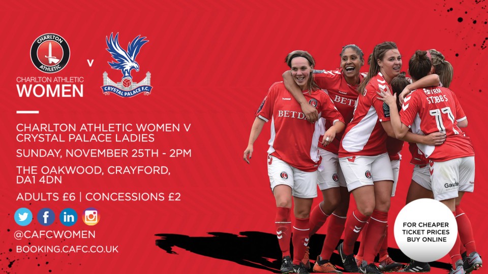 The in-form Charlton Athletic Women’s team host Crystal Palace Ladies at The Oakwood in Crayford on Sunday, November 25th and they are looking to get as big a crowd as possible to cheer the Addicks to victory in the local derby.