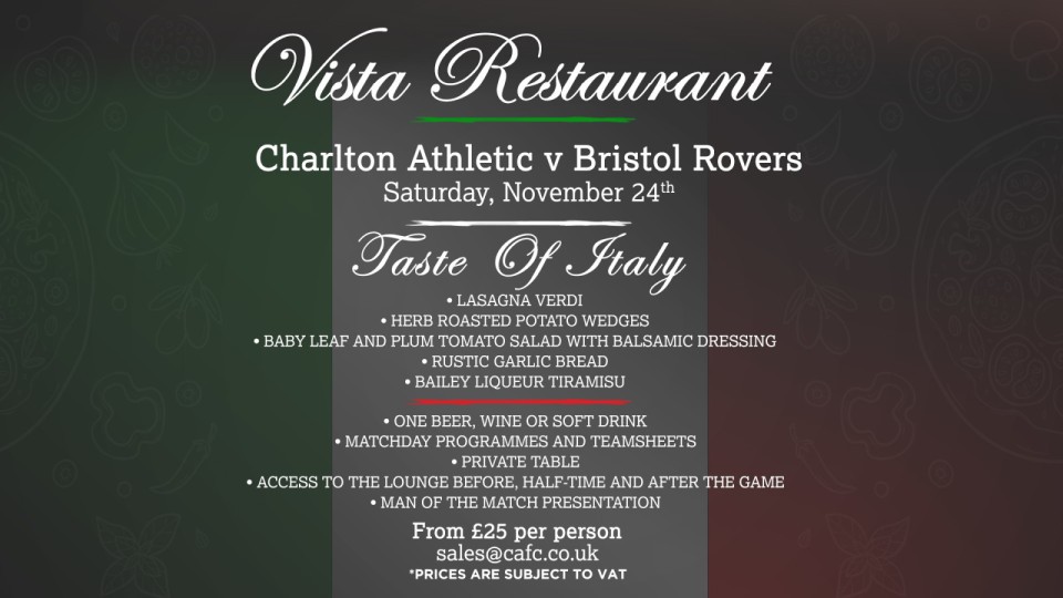 Charlton supporters can enjoy a two-course, Italian set-menu ahead of our home game against Bristol Rovers on Saturday, November 24th (3pm).