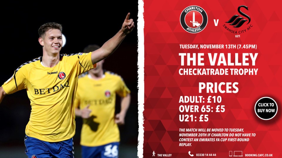 Charlton’s Checkatrade Trophy group match against Swansea City U21 has been confirmed for Tuesday, November 13th at The Valley (7.45pm).