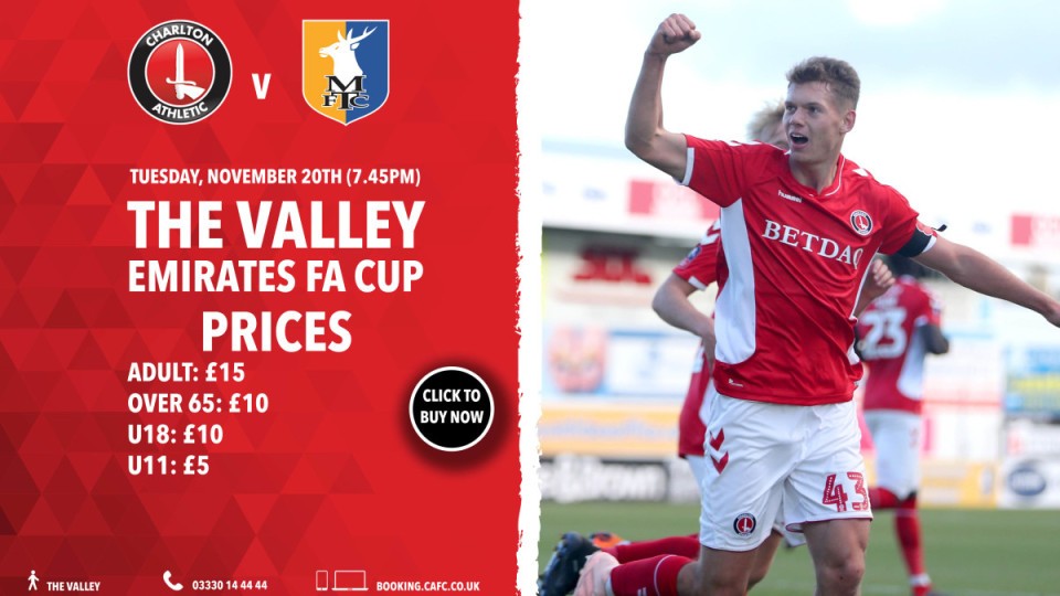 Charlton will be eyeing a place in round two of the Emirates FA Cup on Tuesday night when they host Mansfield Town in a first-round replay (7.45pm).