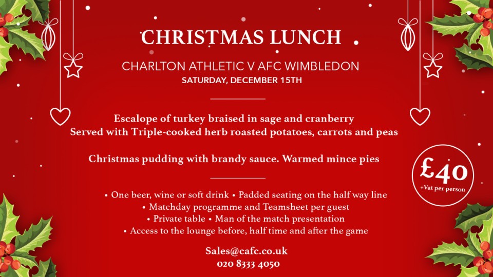 Supporters can get into the festive spirit before Charlton’s Sky Bet league One clash against AFC Wimbledon on Saturday, December 15th by enjoying a traditional Christmas lunch in SE7.