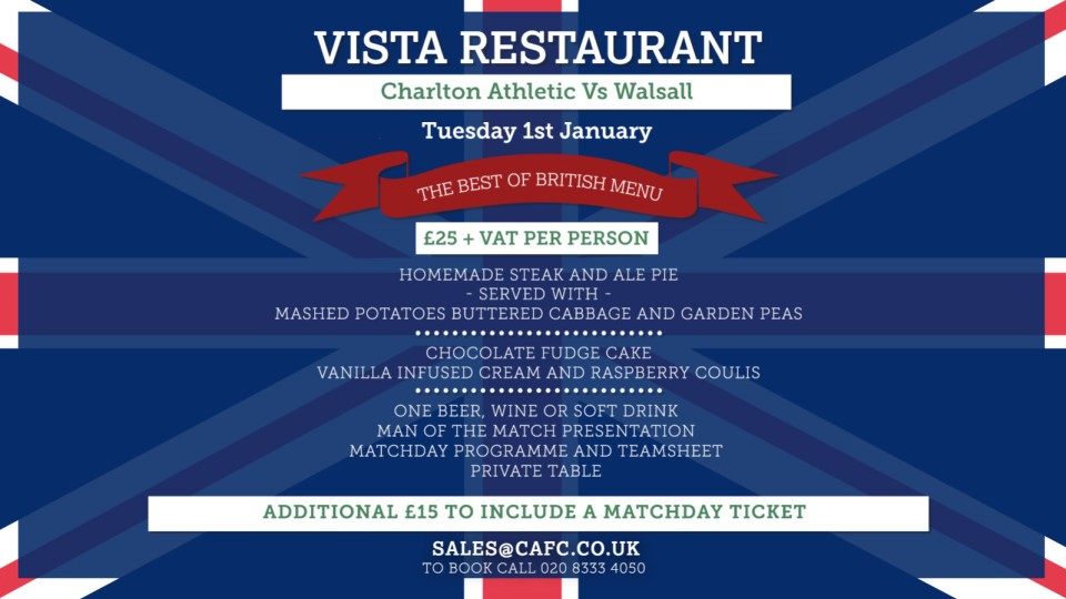 Charlton supporters can enjoy a two-course, Best of British-themed set-menu ahead of the Addicks’ home game against Walsall on New Year’s Day (3pm).