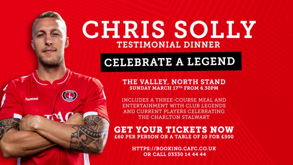 Supporters can celebrate the career of Charlton legend Chris Solly by joining him and a number of special guests at his testimonial dinner on Sunday, March 17th.