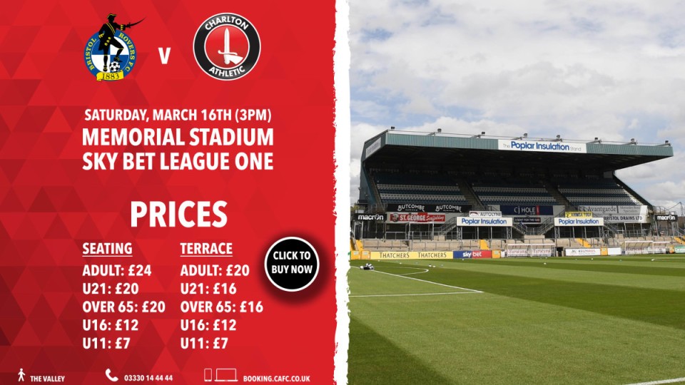 The Addicks head west to Memorial Stadium on Saturday, March 16th and we have been handed an allocation of 1,091, which is split between seating and terracing.