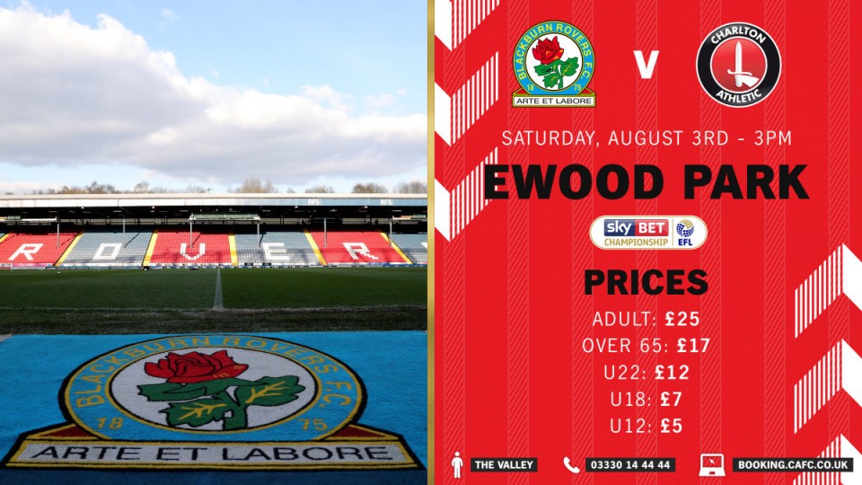 The Addicks will kick off their return to the Championship with a trip to Ewood Park on Saturday, August 3rd (3pm) and an initial allocation of 1,044 went on general sale on Wednesday morning.