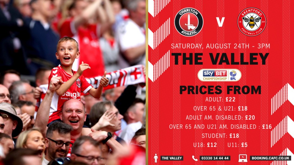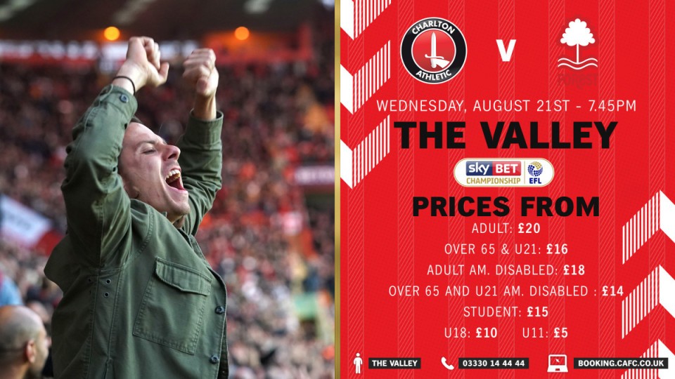 Meanwhile tickets for Charlton's hosting of Nottingham Forest on Wednesday, August 21st (7:45pm) will go on sale tomorrow, and the game has been listed as a Silver category fixture. Prices can be found in the image below.