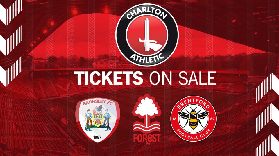 Tickets for Charlton's trip to Barnsley are now on sale, alongside tickets for the two home fixtures against Nottingham Forest and Brentford.