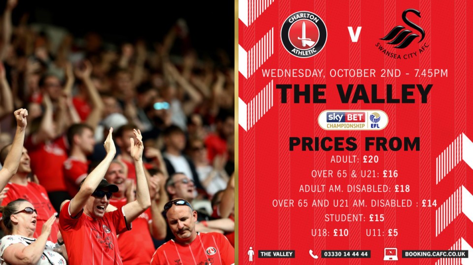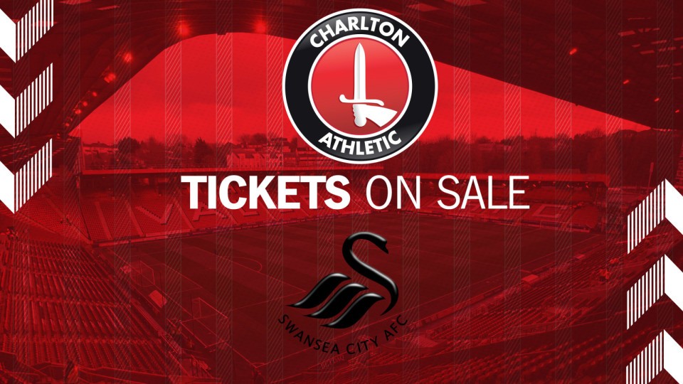 Tickets for Charlton's home game against Swansea City on Wednesday, October 2nd (7:45pm) will go on sale from Tuesday, September 3rd (9:30am).