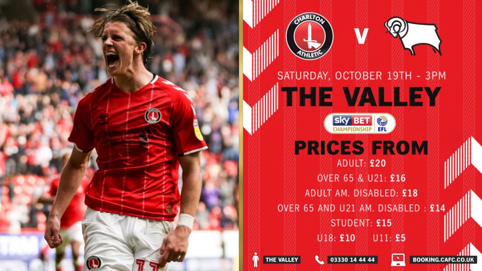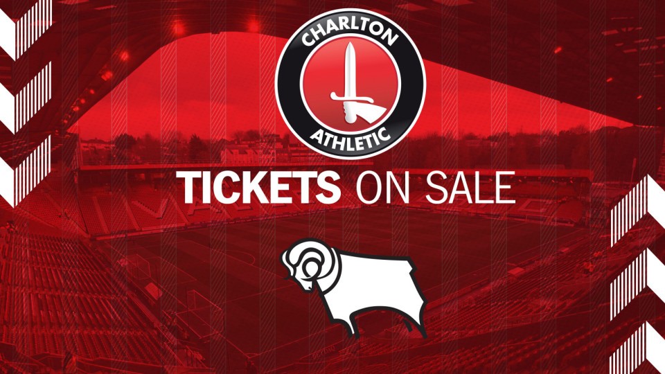 Tickets for Charlton's game against Derby County on Saturday, October 19th are now on sale.