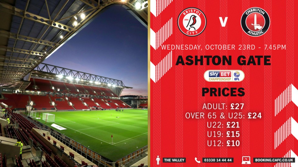 Seats for the trip to face Bristol City at Ashton Gate on Wednesday, 23rd October (7:45pm) will be going on general sale with Charlton handed an allocation of 1,037.
