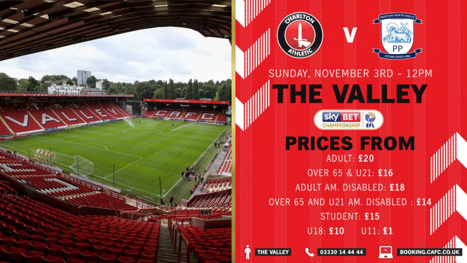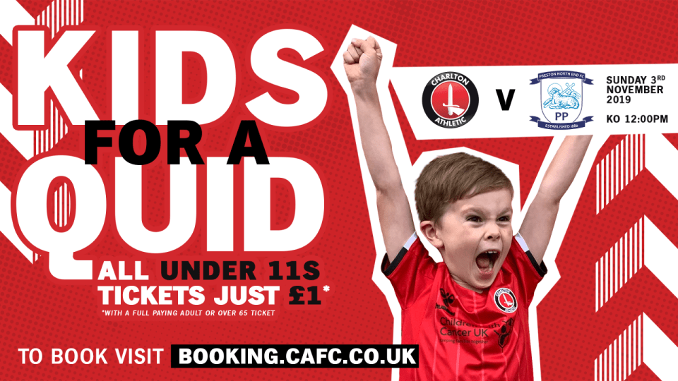 Tickets for Charlton's home match against Preston North End on Sunday, November 3rd (12pm) are now on sale with the game designated as a Kids for a Quid fixture.