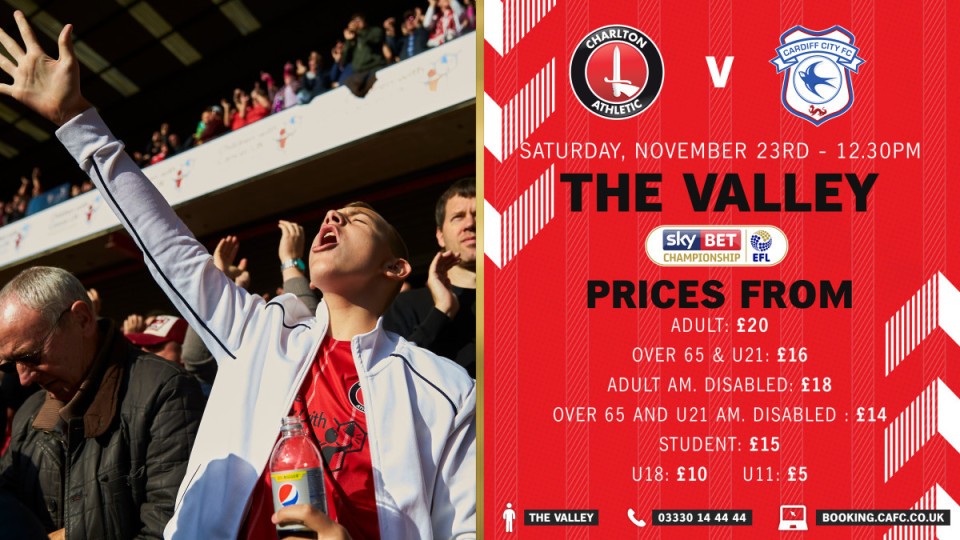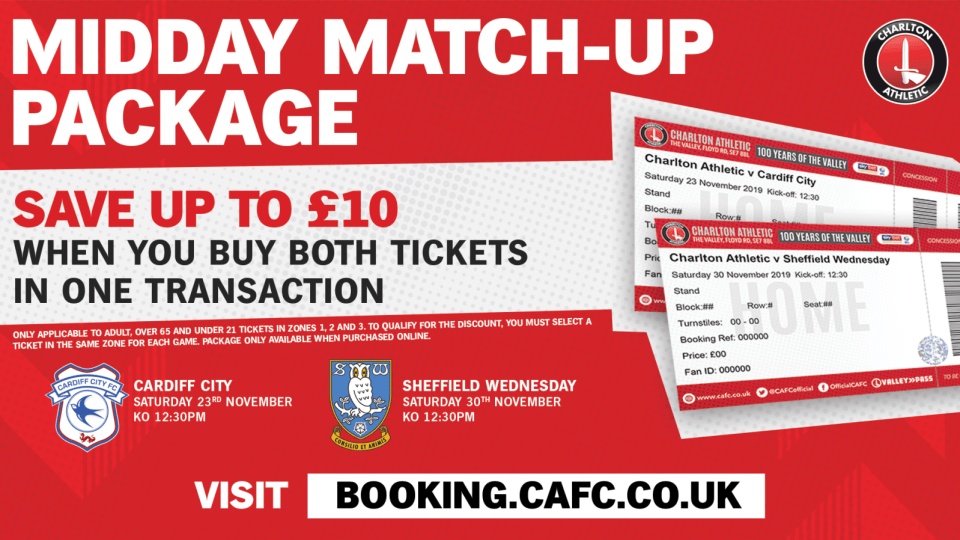 Supporters can save up to £10 when they book tickets for the Addicks' clashes against Cardiff City (Saturday, November 23rd) and Sheffield Wednesday (Saturday, November 30th).