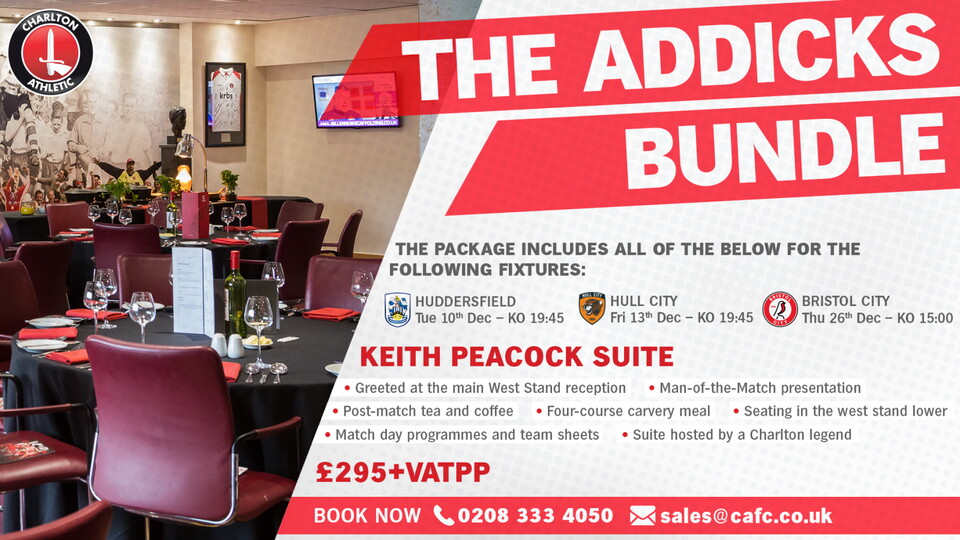 With the package you will be greeted at the main West Stand reception and taken to enjoy a four-course carvery meal before cheering on the Addicks from seats in the West Lower. While at the game you will be given complimentary programmes and teamsheets.