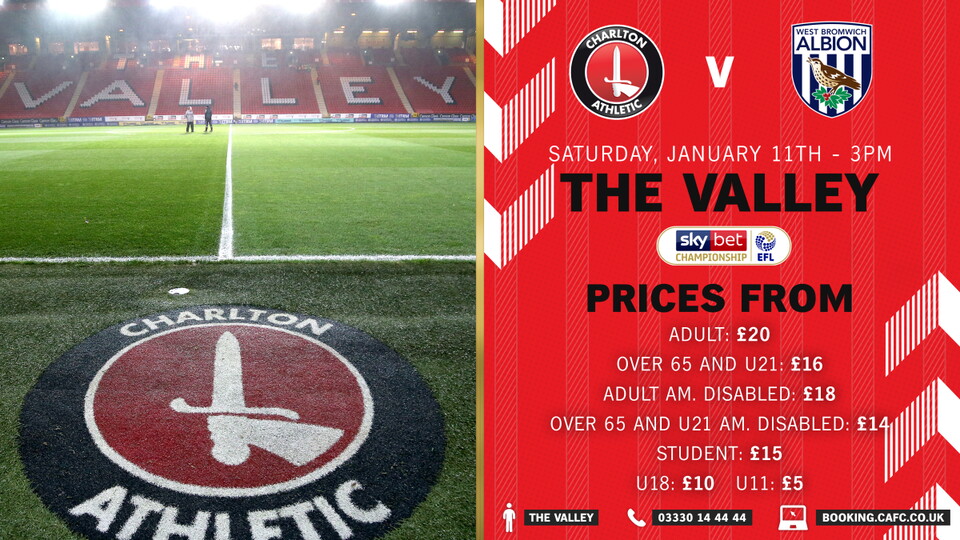 Tickets for the league visit of West Bromwich Albion to The Valley on Saturday, January 11th will be going on sale on Tuesday at 9.30am.