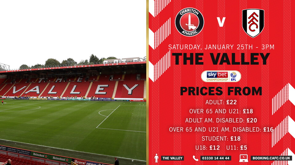 Tickets for the visit of Fulham to The Valley on Saturday, January 25th (3pm) will be going on sale on Friday morning at 9.30am.