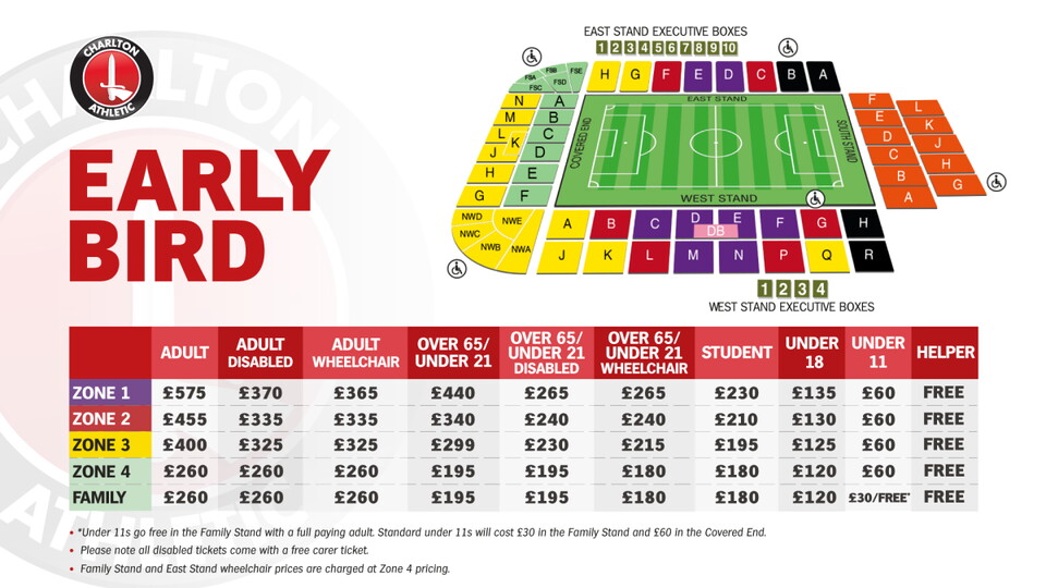 Fans looking for best value should purchase before midnight on July 31st, with last season’s Championship pricing set to increase by five per cent for Phase Two purchasing should Charlton remain in the division. Increases on the early-bird discount are in place should the club be relegated to League One.