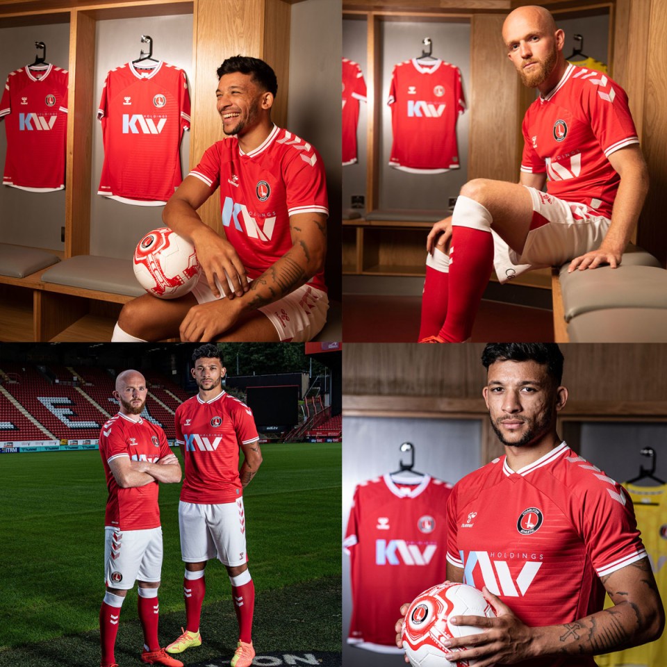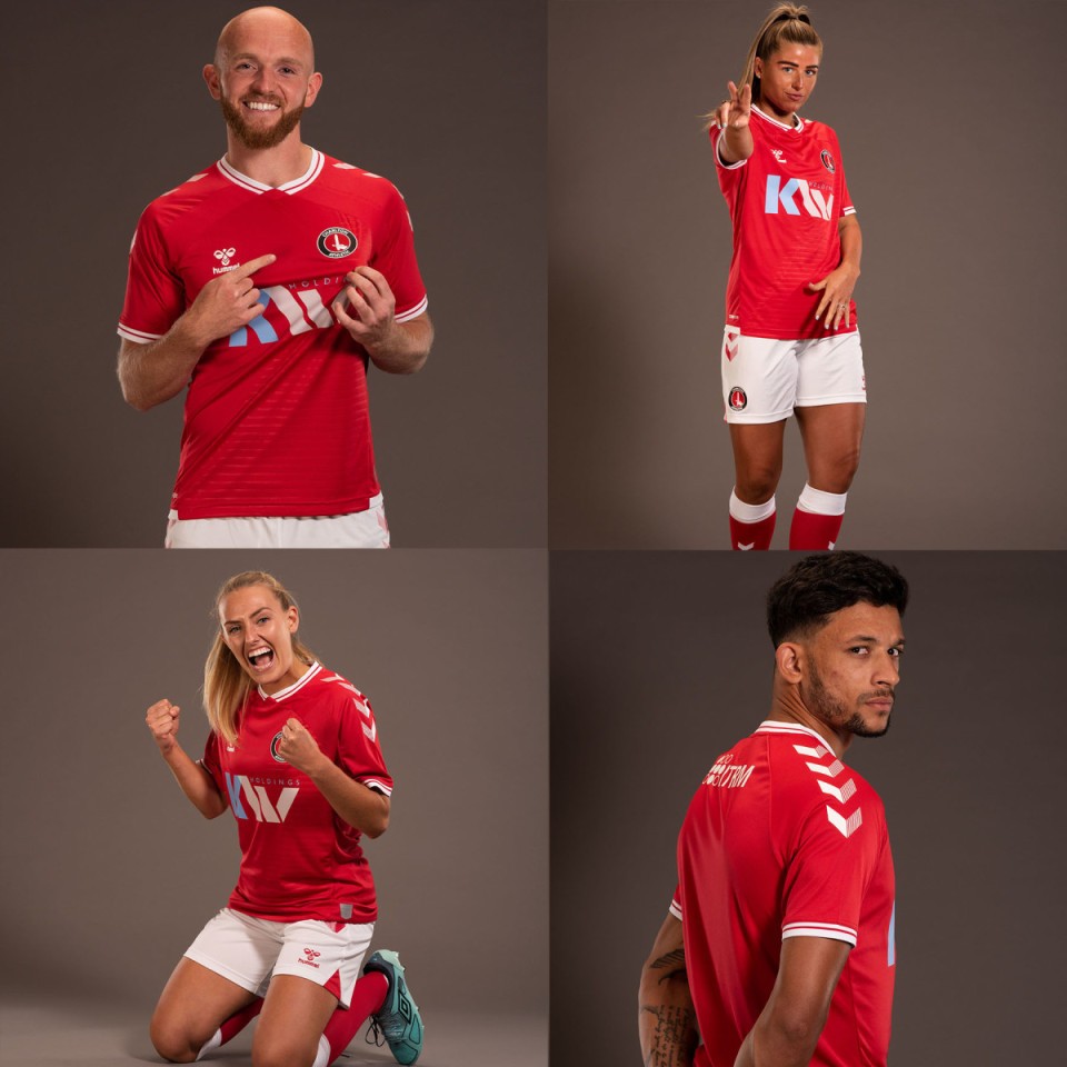 The red shirt, which bears the name of new Charlton-supporting sponsors KW Holdings on the chest, features a simple neck design with a striking white trim which is matched on the cuffs of the sleeves.