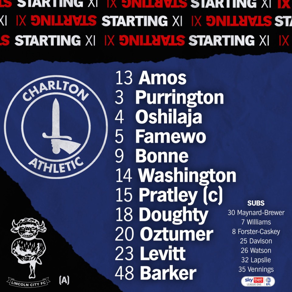 Charlton: Amos; Barker, Oshilaja, Famewo, Purrington; Oztumer, Pratley (C), Levitt, Doughty; Washington, Bonne