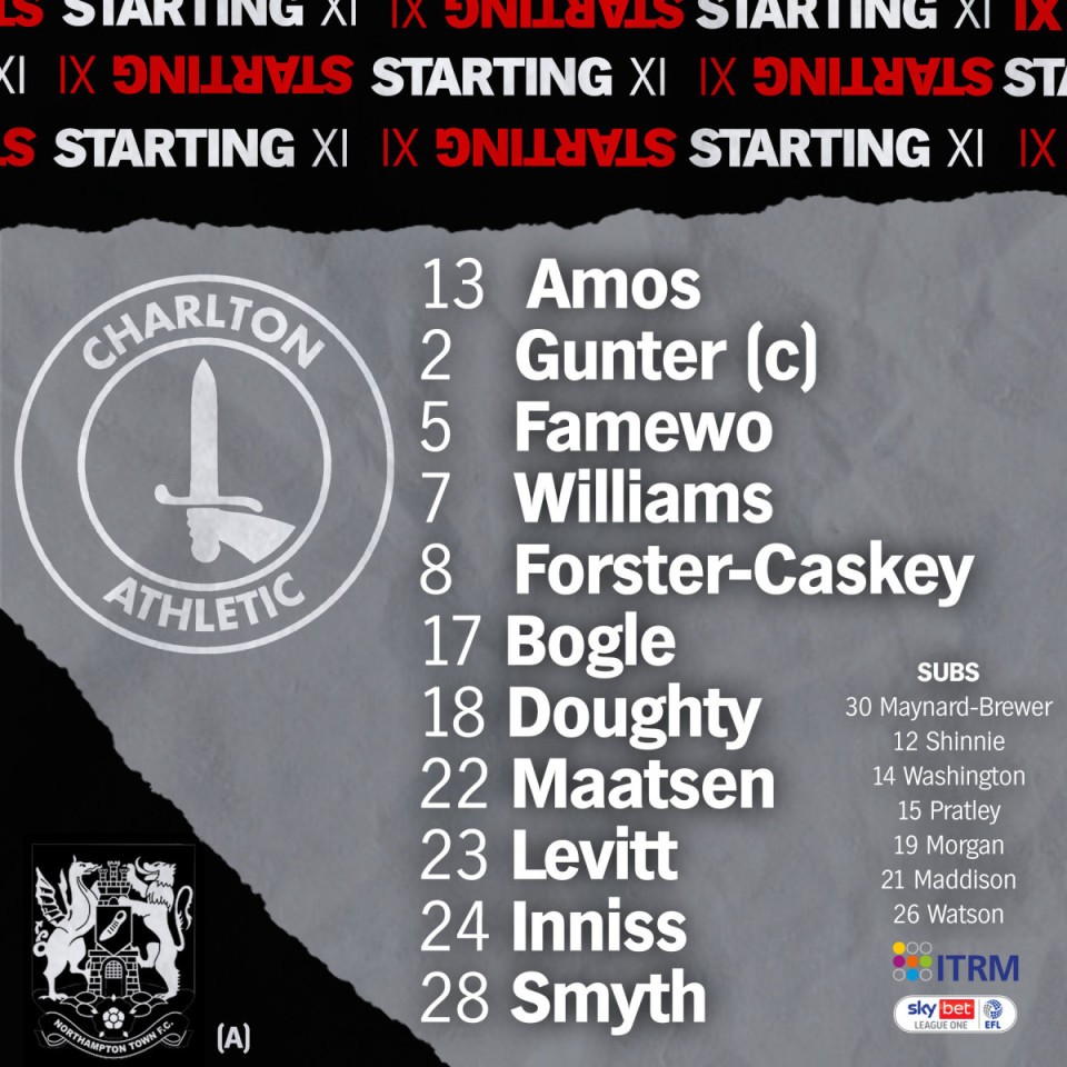 Charlton: Amos; Gunter (C), Inniss, Famewo, Maatsen; Forster-Caskey, Levitt, Willliams; Doughty, Bogle, Smyth