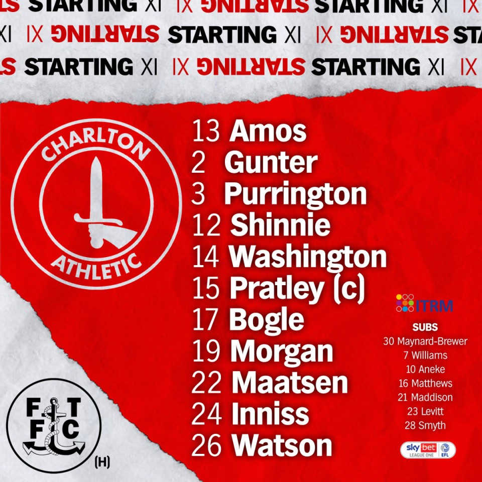 Charlton: Amos; Gunter, Pratley (C), Inniss, Purrington; Watson, Morgan, Maatsen, Shinnie; Washington, Bogle