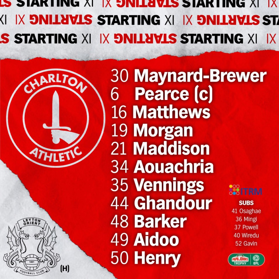 Charlton: Maynard-Brewer; Matthews, Barker, Pearce (C), Aidoo; Morgan, Henry, Vennings; Maddison, Aouachria, Ghandour
