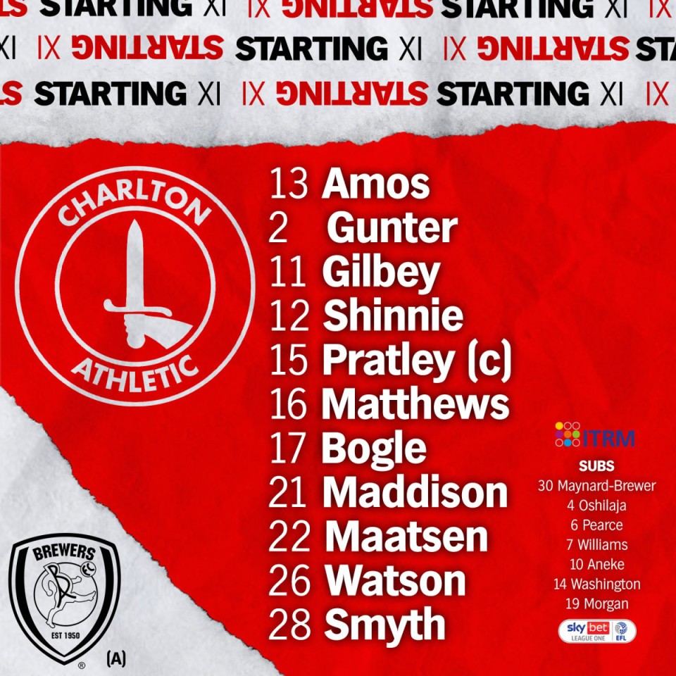 Charlton: Amos; Matthews, Gunter, Pratley (C), Maatsen; Watson, Gilbey, Shinnie, Maddison; Smyth, Bogle