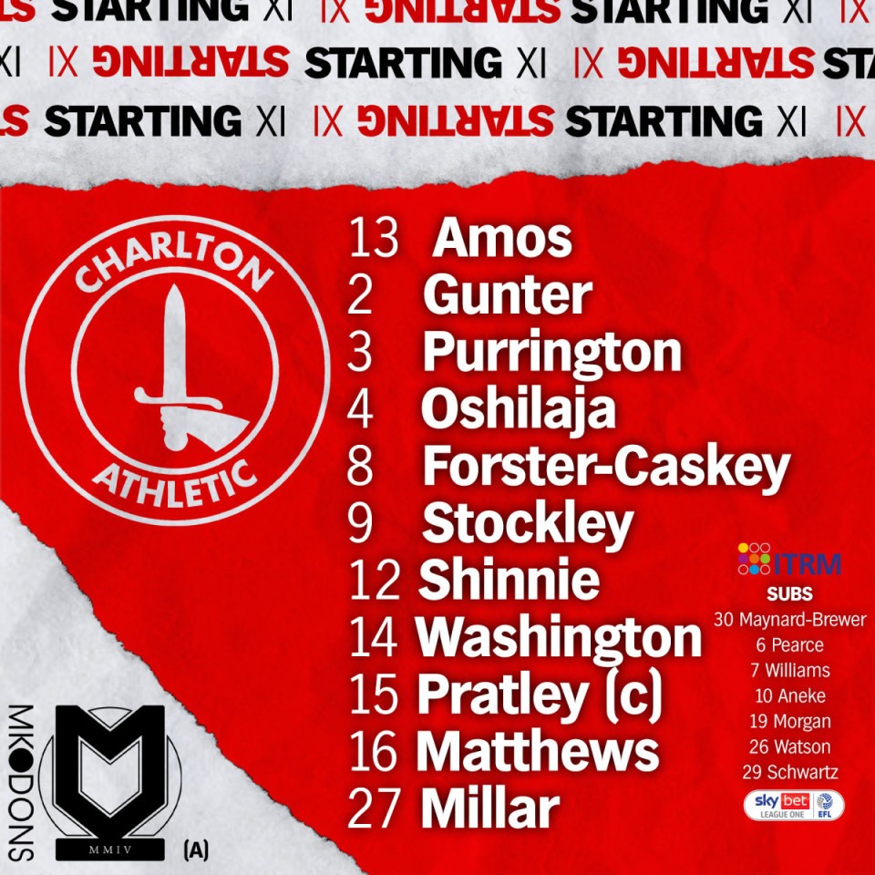 Charlton: Amos; Matthews, Gunter, Oshilaja, Purrington; Shinnie, Pratley (C), Forster-Caskey, Millar; Stockley, Washington