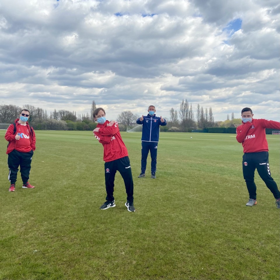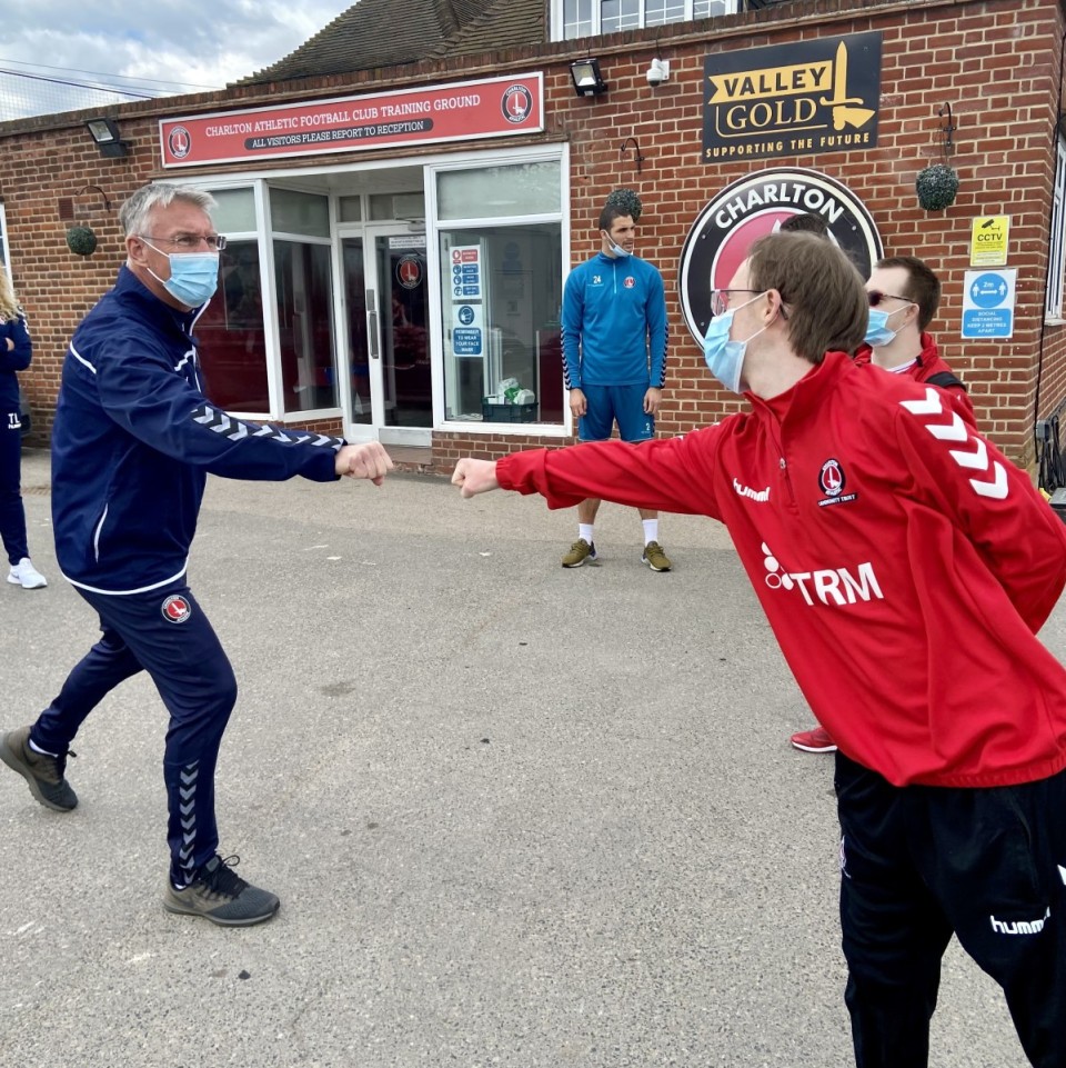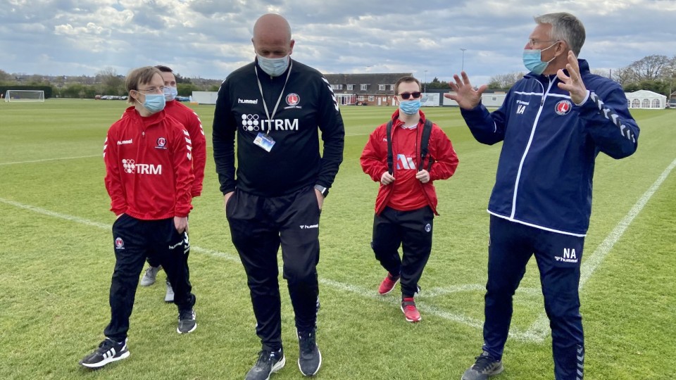 Charlton boss Nigel Adkins met James, Will and Jonathan from the Charlton Upeats, alongside Head of Early Help and Prevention for Charlton Athletic Community Trust, Carl Krauhaus at Sparrows Lane on Tuesday afternoon and took a walk around the training ground to learn more about the Upbeats programme.