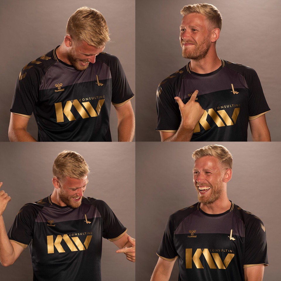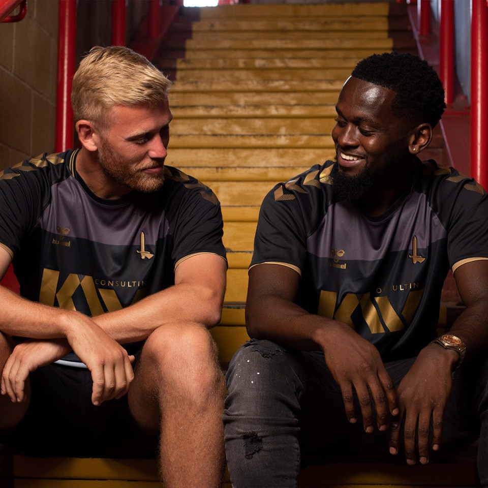 The black and gold strip, modelled by Jayden Stockley and Diallang Jaiyesimi, commemorates the centenary of the Addicks’ election into the Football League in 1921 and features the special inclusion of a simplified version of Charlton’s iconic sword emblem, stitched in gold on the chest.